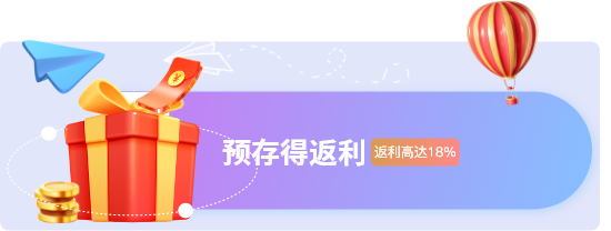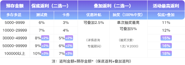 活動(dòng)期間預(yù)存金額滿¥5000,即可享受多重返利,最高可達(dá)18%。(預(yù)存費(fèi)用需在7月15日前到賬,若未到賬則視為自動(dòng)放棄本次活動(dòng))