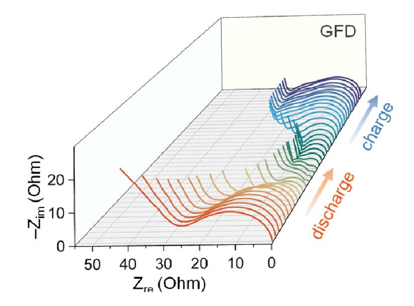 作者對兩類電池進(jìn)行了原位電化學(xué)阻抗譜測試,研究發(fā)現(xiàn)采用GFD隔膜的電池阻抗放電時(shí)減小,充電時(shí)增大,而采用PVA隔膜的則全稱保持穩(wěn)定。這與其背后的反應(yīng)機(jī)理有關(guān):PVA隔膜可以使整個(gè)反應(yīng)過程更穩(wěn)定,不存在因?yàn)橐合嗳芙鈱?dǎo)致的阻抗變小。