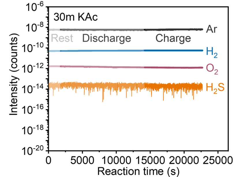 作者對高濃電解液中硫電極進(jìn)行了產(chǎn)氣監(jiān)測,發(fā)現(xiàn)無氫氣,氧氣或硫化氫生成,證明了硫電極在該電解液中的反應(yīng)穩(wěn)定性。