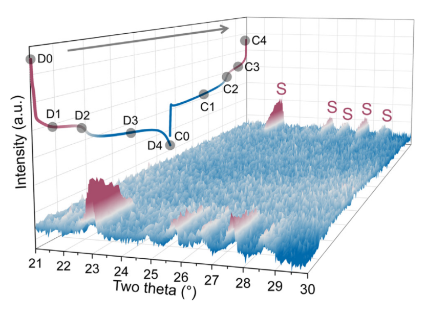 作者對水系硫電極進(jìn)行了原位XRD測試,發(fā)現(xiàn)硫電極在放電時(shí)峰逐漸消失,在充電時(shí)峰重新出現(xiàn),這證明硫電極發(fā)生了轉(zhuǎn)化反應(yīng),同時(shí)電極也具有高度可逆性。