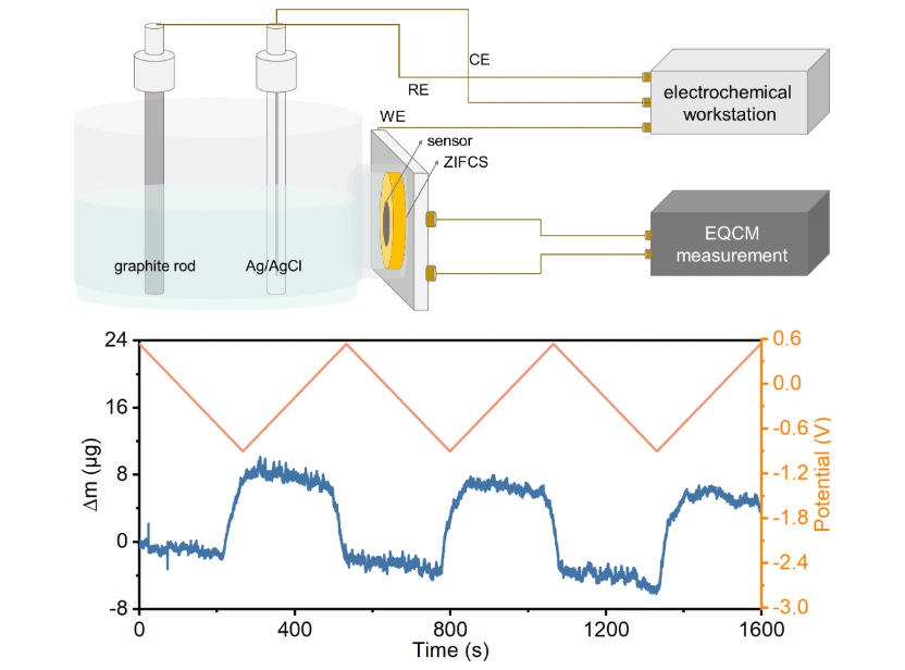 作者利用電化學(xué)石英晶體微晶天平(EQCM)監(jiān)測了硫電極在充放電時(shí)的質(zhì)量變化,一方面證實(shí)了點(diǎn)電化學(xué)反應(yīng)的可逆發(fā)生,另一方面又發(fā)現(xiàn)了循環(huán)過程中電極物質(zhì)的持續(xù)損失。