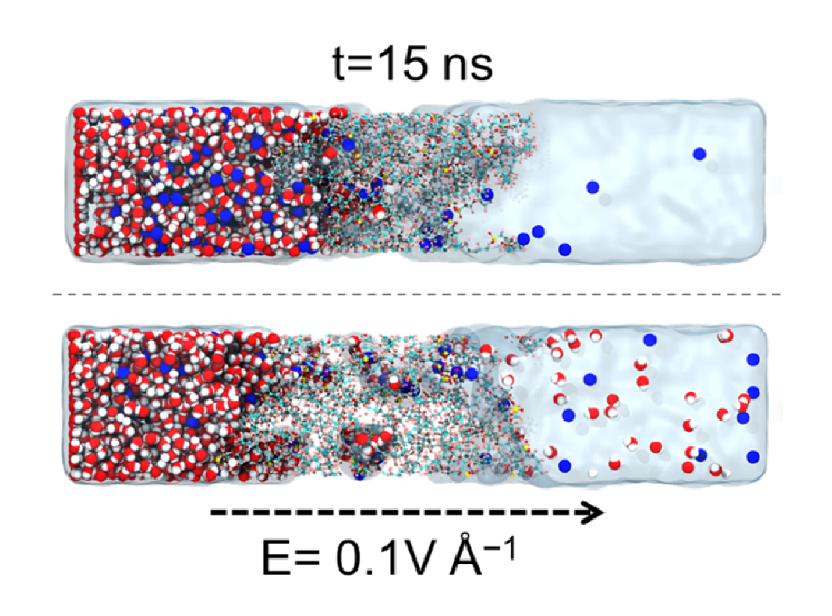 作者通過通過分子動(dòng)力學(xué)計(jì)算證明,在飽和NaOTf的電解質(zhì)中,Na?離子可以輕松穿透膜,進(jìn)一步與硫物種反應(yīng),而沒有檢測到遷移的水。相比之下,在原始電解質(zhì)中,水分子會(huì)向陰極側(cè)遷移。該研究證實(shí)了電荷載流子的貧水配位結(jié)構(gòu)可以抑制電池系統(tǒng)中的水遷移。